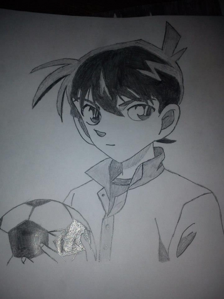 Das ist glaub ich eine von diesen schwarzen Flächen auf dem Ball.<br /> Es glänzt so, weil mit dem Bleistift ziemlich doll aufgedrückt wurde und jetzt vom Licht<br /> reflektiert wird!<br /> <br /> Jetzt zum Bild: sieht riiiichtig klasse aus! Das ist aus der Sidestory zum 12. Film, stimmt's? ^^