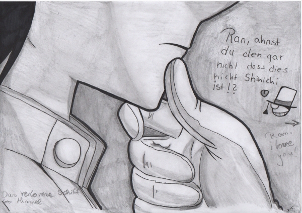 Snauz was für ein Zufall xD<br /> Den Film hab ich mir erst gestern angesehen....Kid ist echt ein Romaniker... xD<br /> Trotzdem hat er was gemacht, was Shinichi niemals gemacht hätte und Ran hat es so gemerkt. Tja er hätte sie nicht an dieser gewissen Stele anfassen dürfen xD<br /> Wie immer schön gezeichnet ;), vor allem der Handschuh gefällt mir
