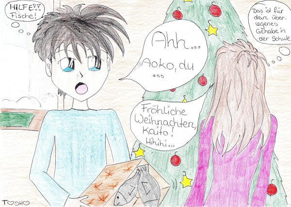 Super Idee, aber wenn du Kaito wieder mit Fischen zusammen zeichnest, solltest du ihn etwas "überraschter" zeichnen. Er reagiert normalerweise nicht so ruhig ;)
