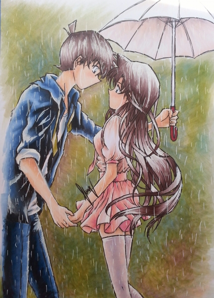 (101)Ich liebe das Kleid von Ran, würd ich glatt selbst tragen wollen. Ich finde außerdem sehr schön das Shinichi den Regenschirm über Ran hält (Ein echter Gentleman) Auch die Gesichtsausdrücke sind überzeugend und wie alle anderen schon schrieben sehr harmonisch, mit tollem Hintergrund und tollem Schattenspiel bei Kleidung und Haaren.