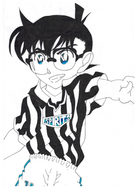 (7)Conan im Tokio Spirits Trikot. Einfach perfekt. Gefällt mir richtig gut. Auch das du den Hintergrund des Sprits Schriftzugs, die Streifen und die Zahl bei der Hose und auch die Augen coloriert hast gefällt mir. Hast du schonmal darüber nachgedacht ihn komplett, mit Schatten, zu colorieren?<br /> Ich bin mir sicher das du das hinbekommen würdest.
