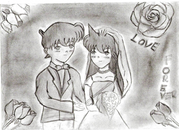 (22)Die Anderen nehmen mir die Worte aus dem Mund. Es sieht fast aus als ob du dabei gwesen wärst. Bei diesem Bild hast du vorallem diese Zufriedenheit der beiden sehr gut rüber gebracht und wie glücklich sie aussehen *-*. Deine Rosn finde ich sowieso toll- auch die Idee sie so in die Ecken zu zeichnen.<br /> Ich wette in einigen Jahren, nach einem Happy End, steht dieses Photo bei Ran und Shinichi im Wohnzimmer!