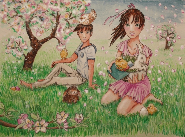Oh mein Gott, wie hammersüß und wunderschön ist das bitte? *OOOOOO* <br /> <br /> Man, der Hintergrund mit dem Gras und alldem "Grünzeugs'" ist echt der wahnsinnige hammermäßige oberhammer... ~ xDDDDD<br /> Besonders die Küken, das Huhn und der Hase sind gut geworden. :3