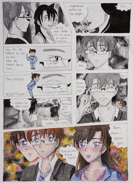 Aaaaaahhh!!!! Wie toll ist das denn????<br /> Ich schau auf das letzte Bild zuerst (Keine Ahnung wieso, mich hat wahrscheinlich interessiert, wer der Typ ist xD), les dann so &quot;Nein, nein ... schon gut. Italienisch klingt super.&quot; und denk mir so: &quot;Oh mein Gott, das ist ja die Stelle aus dem letzten Kapitel aus Lost in Time von Shelling!!!&quot; *freu* *megafreu* *megasuperdollfreu*<br /> Du hast Bell wirklich gut hinbekommen und Ran auch - ich finde, sie wirkt wirklich wie 27 und nicht mehr wie 17, das mit dem Alter ist bei Ran ja ziemlich schwer hinzukriegen, aber du hast das kleine &quot;Problem&quot; einwandfrei gelöst! Auch sehr gut gefällt mir, wie du die Stelle gestaltet hast, als Shinichi selbst versucht, sich einzureden, dass er nicht zusagen soll. Das Endbild gefällt mir ebenfalls, sehr gut mitgedacht, z.Bsp. dass Shinichi unter der Maske rot wird, Bell aber nicht. (Ich nenne ihn immer einfach nur Bell ;-)<br /> Hach, ich finds ja immer noch so suuuuuuper!!! Ich liiiieeebe dein Talent fürs Zeichnen und ich liebe Lost in Time, also ist das die perfekte Mischung! Und ich liebe die Szene!!! Tut mir leid, ich glaub, ich hör damt so schnell nicht mehr auf ...<br /> Ich finds einfach nur so megasuperduperhammerwahnsinnstoooooollllllllll!!!!!<br /> <br /> Soll ich die Fanstory hier verlinken??? Vielleicht hat ja jemand Interesse ...