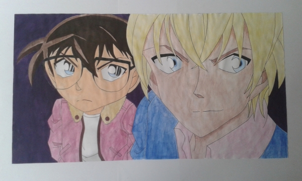 (13)Ein paar Details zum Bild: Benutzt habe ich: für Bourbon: wasservermalbare Buntstifte (daher leider so fleckig), schwarzer Fineliner für Conan: Wasserfarben, schwarzer Fineliner, Bleistift Ich konnte das Bild leider nicht einscannen, da es ca. DIN A3 Größe hat.